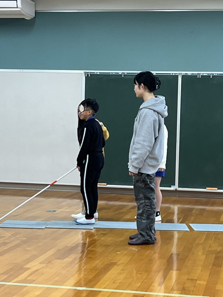 体験は、車椅子で小学校の校内や付近を車椅子に乗ったり押したり、室内に障害物やマットを敷いたコースを白杖を持って歩いたり、白杖を持っている生徒を誘導したりしました。