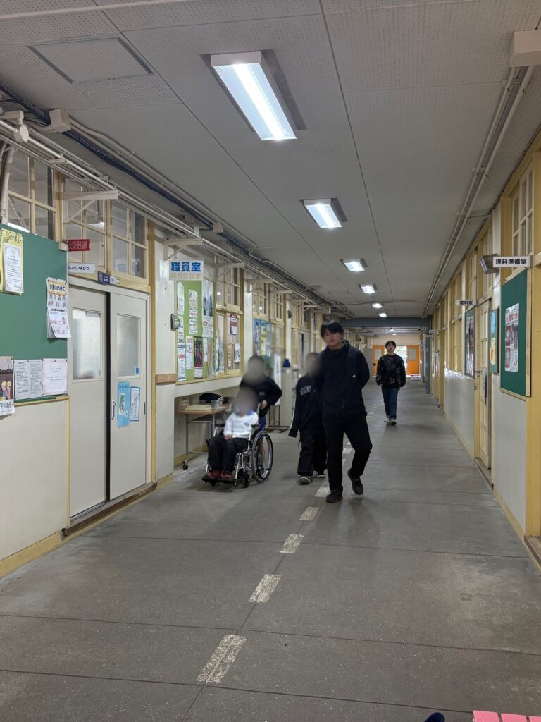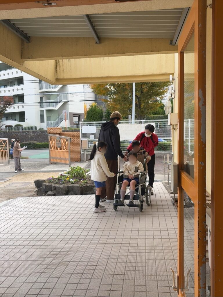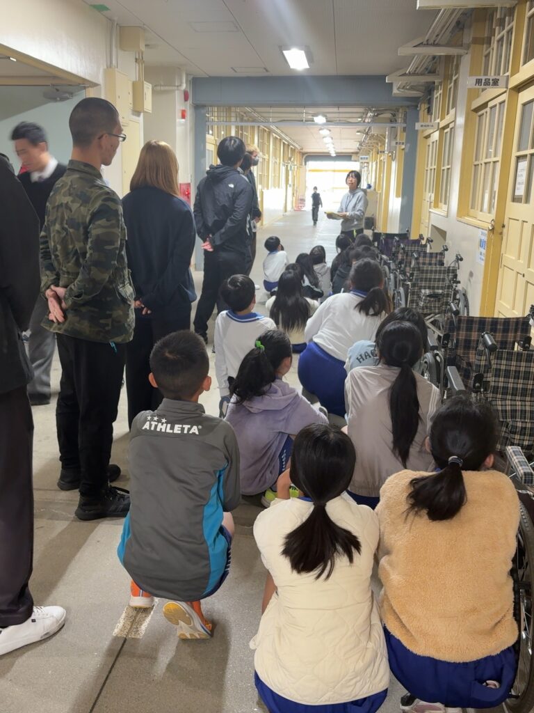 11月12日に神陵台小学校で、小学4年生向けに車椅子・白杖体験が行われ、学生が体験学習のサポートを行いました。