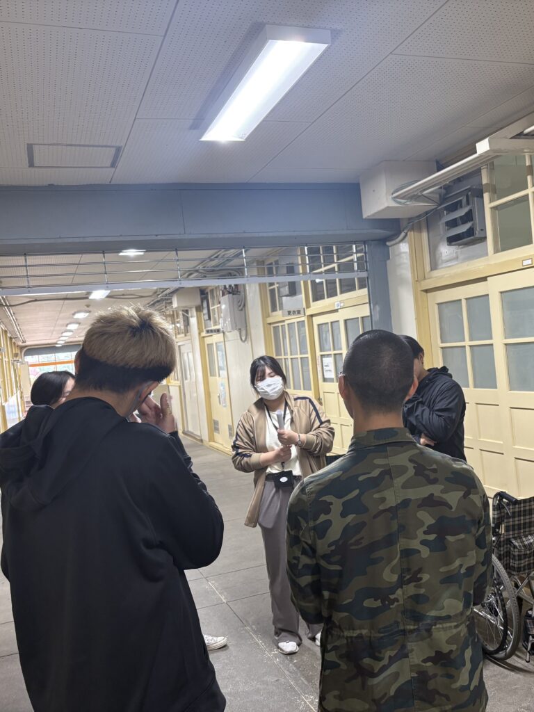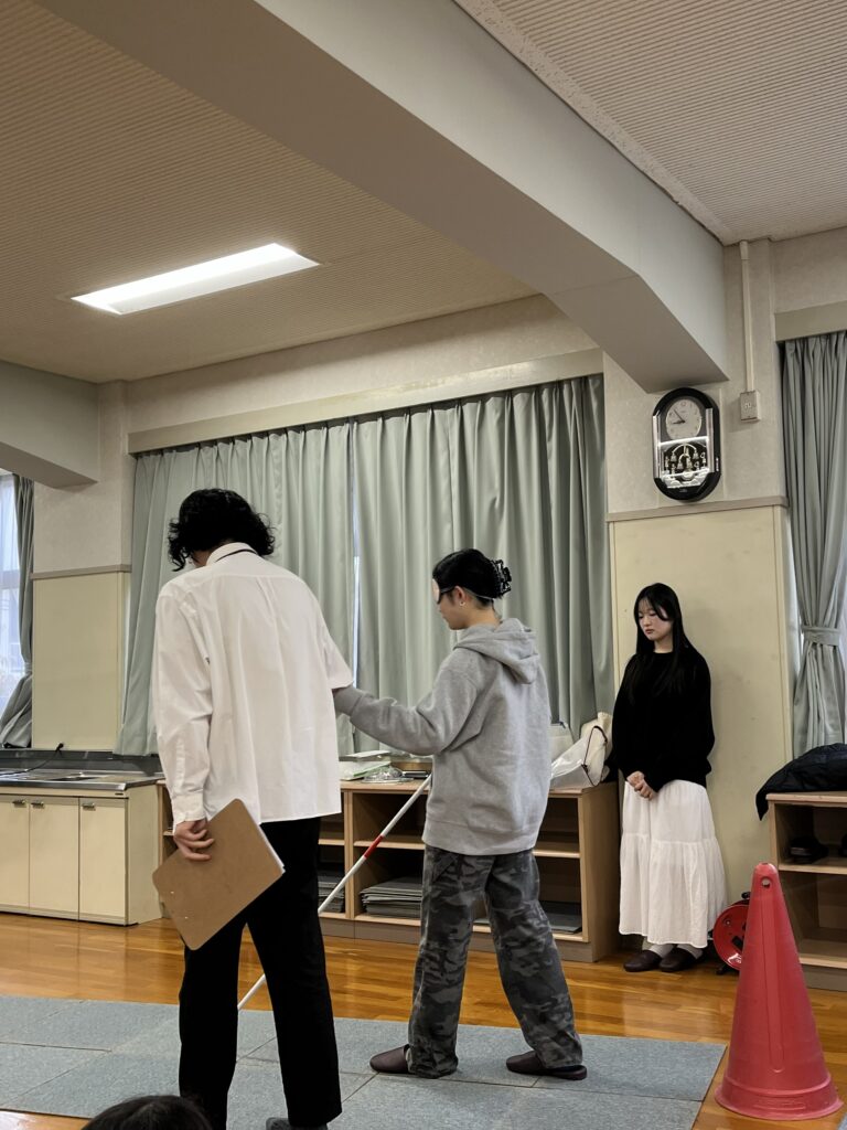 神陵台小学校の周りは、急な坂道や幅の狭い歩道、ガタガタした道もあったため学生は小学生の安全を見守りつつ、スムーズに体験ができるように誘導しました。白杖体験も、アイマスクをし、白杖を持ってコースを周るため、危なくないように見守り、白杖の使い方や支える側の声掛けの仕方を教えるなど、学生が丁寧に小学生に寄り添い学習のサポートを行いました。
